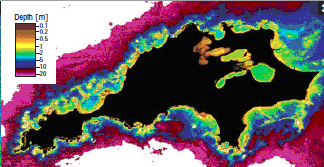 水深數(shù)據(jù)或水下地形對海上貿(mào)易,工業(yè),環(huán)境管理和監(jiān)測等方面是非常重要的。水深測量傳統(tǒng)的方式是通過船上的聲納系統(tǒng)或通過機(jī)載激光雷達(dá)進(jìn)行測深,然后將獲取的數(shù)據(jù)綜合到 DEM 數(shù)據(jù)集中。對大面積清澈的水體來說,現(xiàn)在的光學(xué)遙感方法為量測水深提供了一個替代方案,這個方案更經(jīng)濟(jì)有效。對衛(wèi)星或機(jī)載遙感影像,可以是多光譜衛(wèi)星數(shù)據(jù)也可以是高光譜航攝影像,應(yīng)用精細(xì)的處理器可以推導(dǎo)出精確的水下地形,根據(jù)所輸入的數(shù)據(jù)類型,可以生成不同空間分辨率的水深圖。